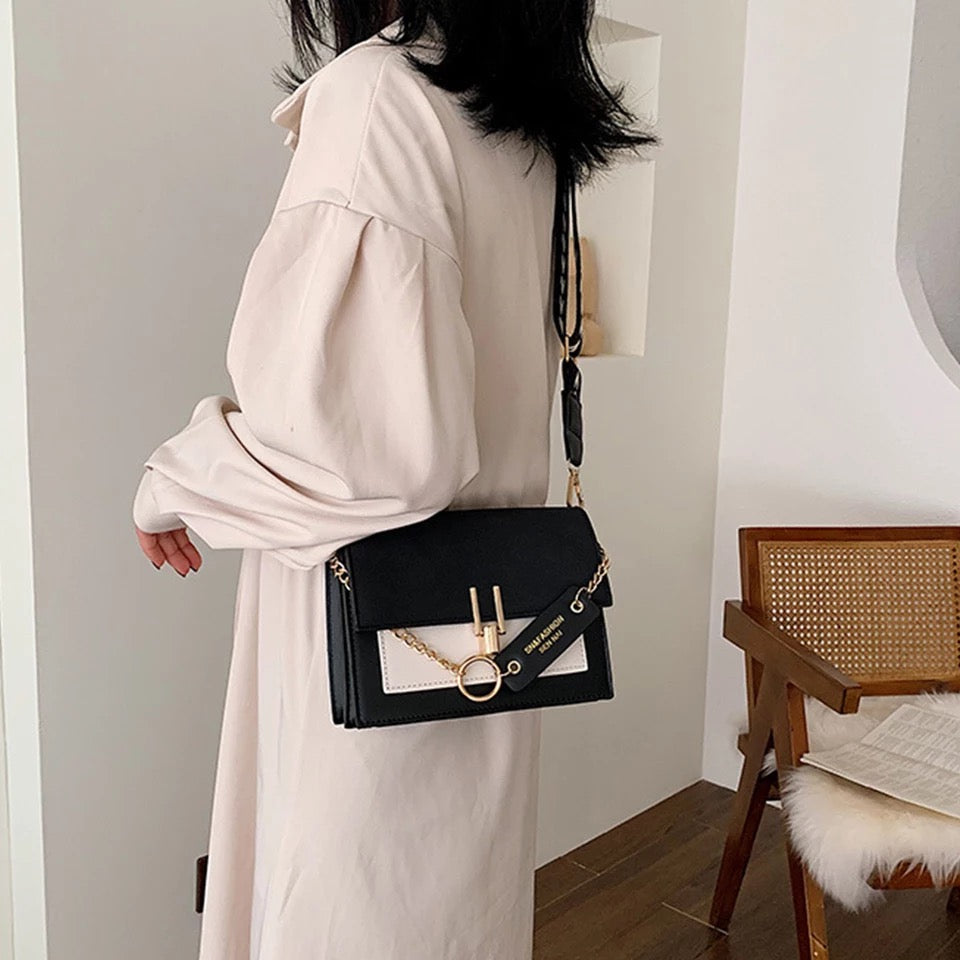 La correa ancha de tela es ajustable y presenta un patrón decorativo, ofreciendo una comodidad excepcional al llevarlo al hombro o cruzado. Además, un detalle de cadena dorada en la parte frontal añade un toque chic y sofisticado. Disponible en combinaciones de colores como marrón/blanco/negro, verde/blanco/negro y negro/blanco/negro, este bolso es perfecto para complementar cualquier atuendo, desde casual hasta más formal. 🚀