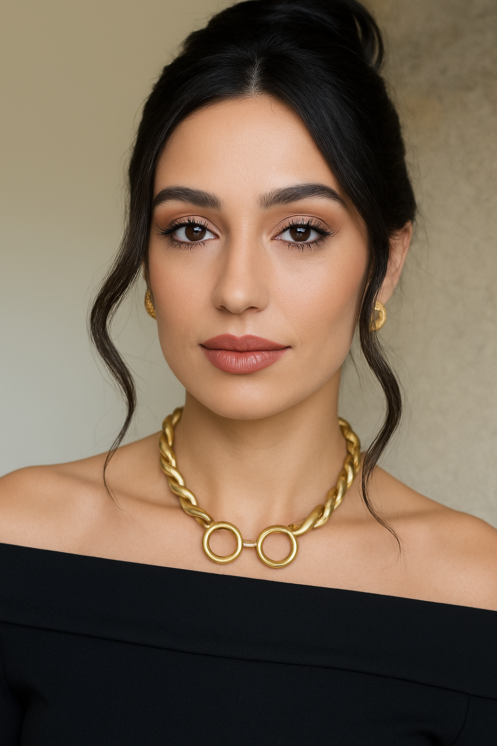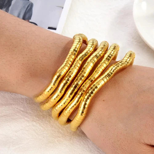 ✨ Diseño trenzado único y contemporáneo 🌟 Acabado en tono dorado brillante y pulido 💖 Extremadamente flexible y adaptable a diferentes formas 👑 Versátil para uso diario o eventos especiales 💎 Material resistente y de fácil mantenimiento