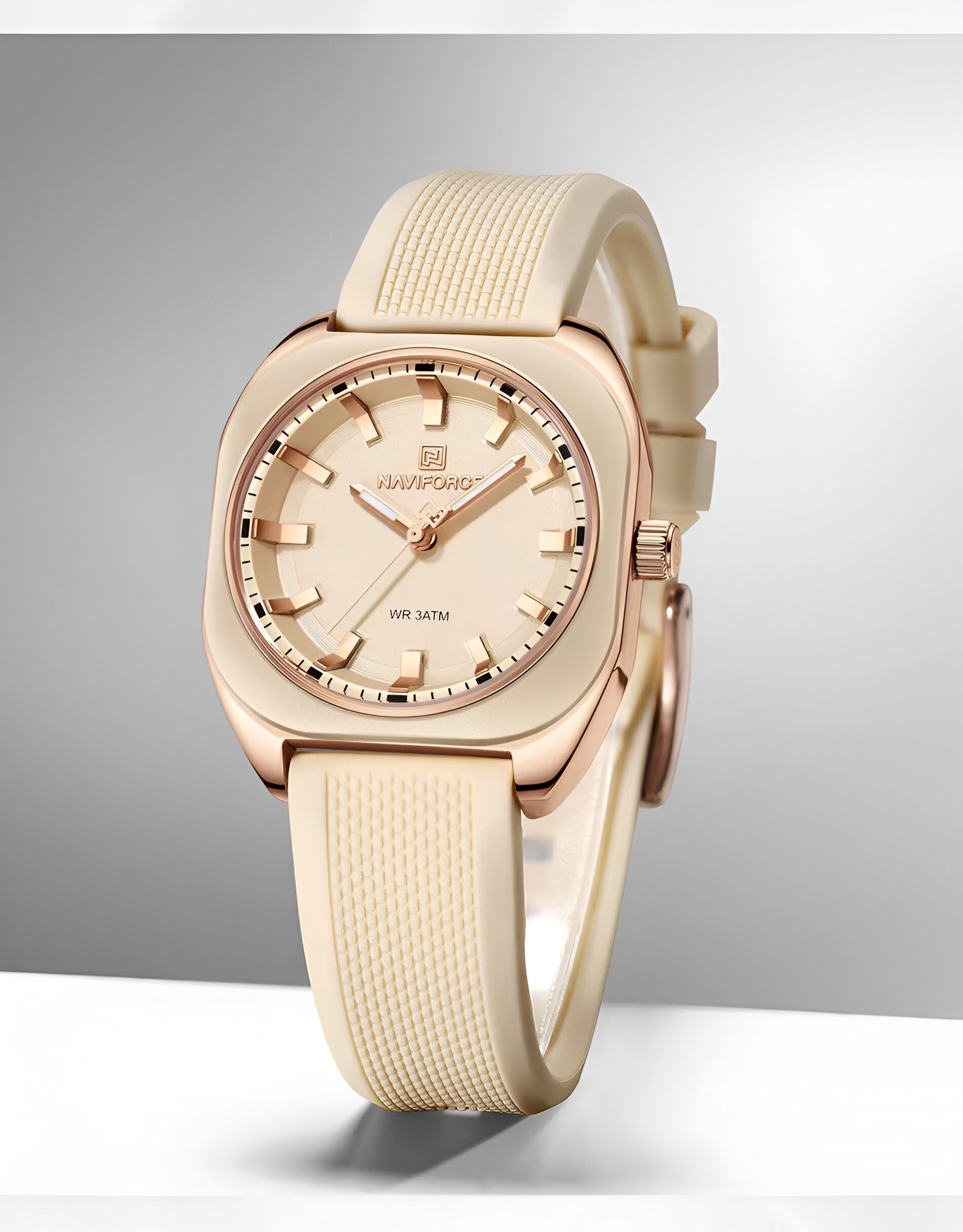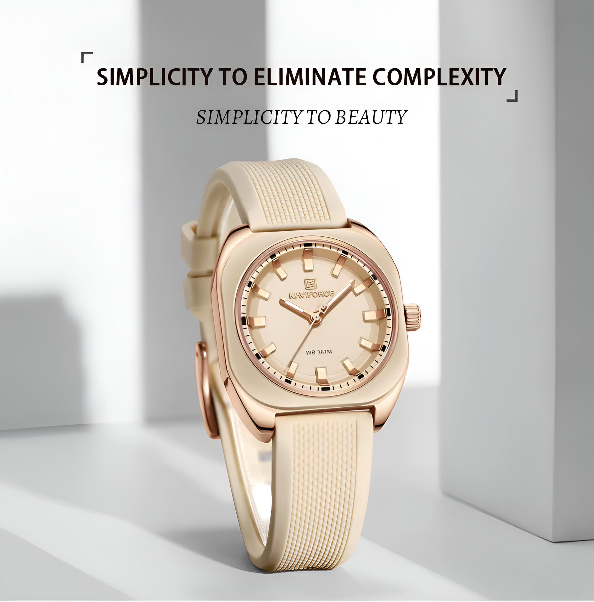 Descripción corta: Reloj de pulsera NAVIFORCE NF5061 con diseño cuadrado-redondo, caja en oro rosa y correa de silicona beige. Resistente al agua 3ATM, combina estilo y funcionalidad para el día a día. 💖
