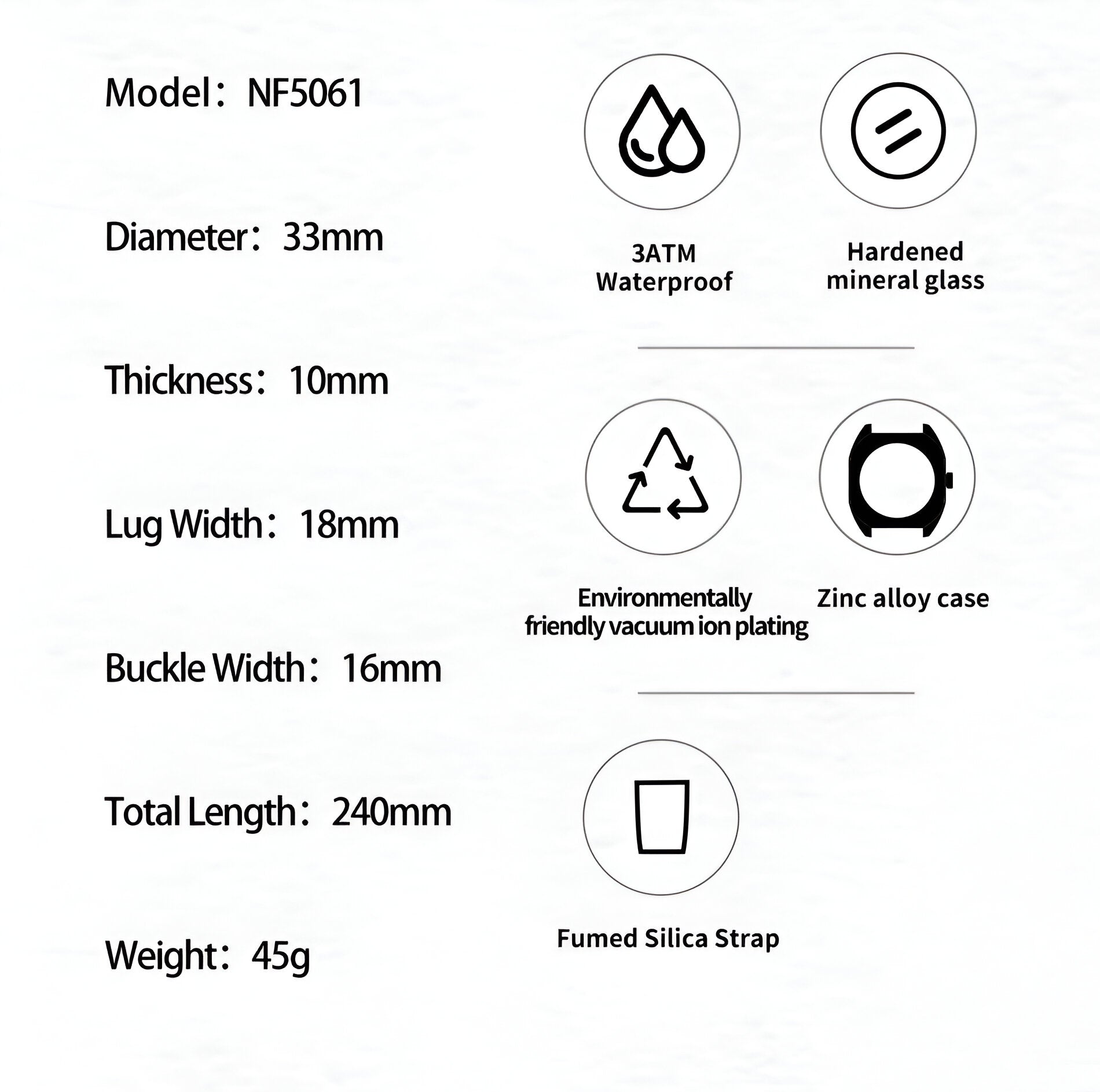 Con un peso ligero de solo 45g y un diseño que prioriza la comodidad, el NAVIFORCE NF5061 es ideal para quienes buscan un reloj que combine estilo, durabilidad y funcionalidad. Su mecanismo preciso asegura una lectura del tiempo confiable, y su chapado iónico al vacío ecológico garantiza un acabado duradero y de alta calidad. 🎁